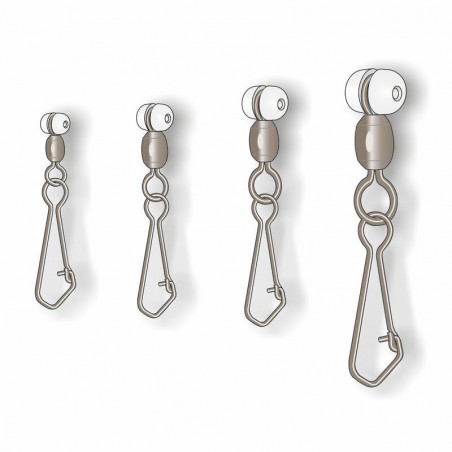 Fermagalleggianti del tipo fisso con girella e moschettone. Muniti di speciali tubetti di bloccaggio che assicurano una eccellente tenuta della posizione.