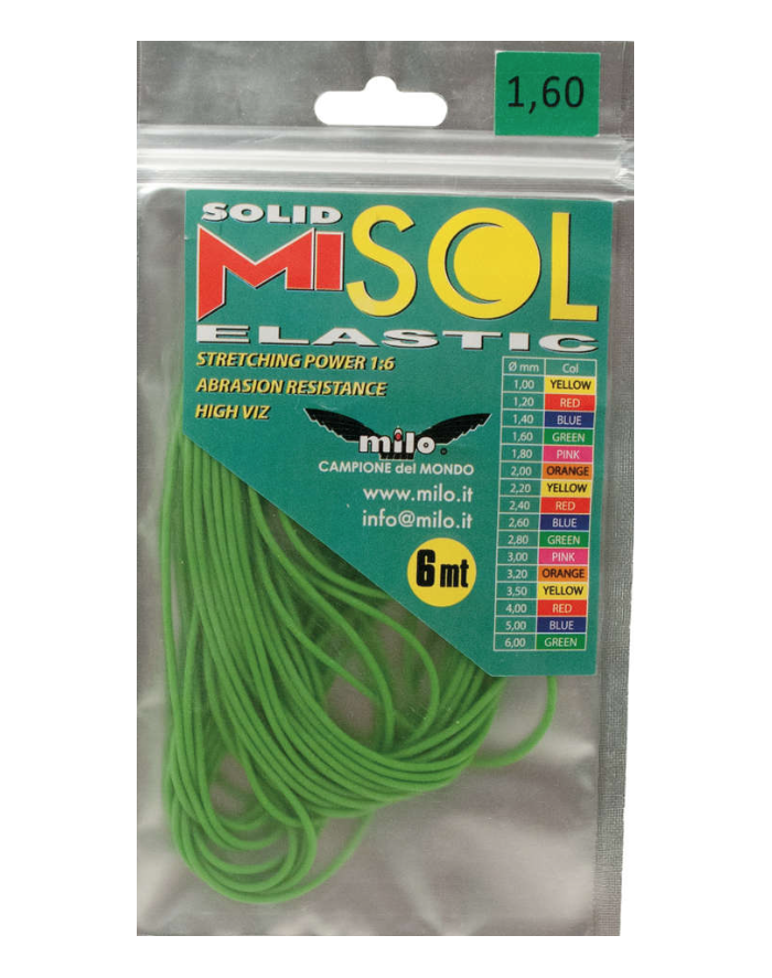 Nuovo super elastico pieno in lattice naturale. L’eccellente resistenza alle abrasioni, il coefficiente di allungamento di 1:6 e la vasta gamma di ben sedici diametri, lo rendono un elastico che ha come principale caratte- ristica la versatilità: un elastico a tutta pesca, ideale sia per la competizione al pesce bianco che per i grossi calibri quali carpe, siluri e storioni. Confezionato in buste che ne preservano la qualità originale, contenenti 6,00 mt. di prodotto, è proposto in sei colori.