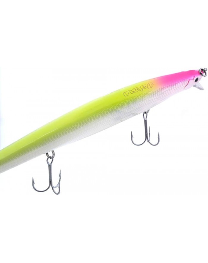 Jatsui lo ha dotato di ogni particolare possibile per renderlo diverso e superiore rispetto ad un JERBAIT oggi in commercio. E' diverso anche nelle colorazioni, infatti sono 4 glow e 3 naturali. Appena in acqua potremo sfruttare le sue migliori caratteristiche entrando in pesca tra i 50 e i 70 cm di profondità. E' stato progettato per lanci lunghi grazie ai pesi mobili e inoltre ha una grande stabilità anche in presenza di forti correnti. Il rollio creato dal bilanciamento e il successivo riposizionamento in asse gli conferisce un nuoto estremamente naturale e catturante. Tipo : long jerk minnow lungh. 18 cm Peso 26 gr Azione floating Depth 20 - 50 cm