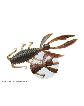 L'Antlion 3,3" è una imitazione di un gambero di piccole dimensioni. Adatto a stiolare l'attacco dei Black Bass! La sua forma compatta è molto semplice da lanciare. Difatti presenta un corpo piatto con "alette" laterali ed una coda formata da 4 tentacoli, 2 nel finale e 2 centrali, con una pallina al centro.Può essere utilizzato sia in acque poco profonde che in acque molto profonde risultando implacabile anche durante la sua caduta. Oltre a Trailer, può essere impiegato con inneschi Drop Shop, Carolina, Split Shot, Texas.
